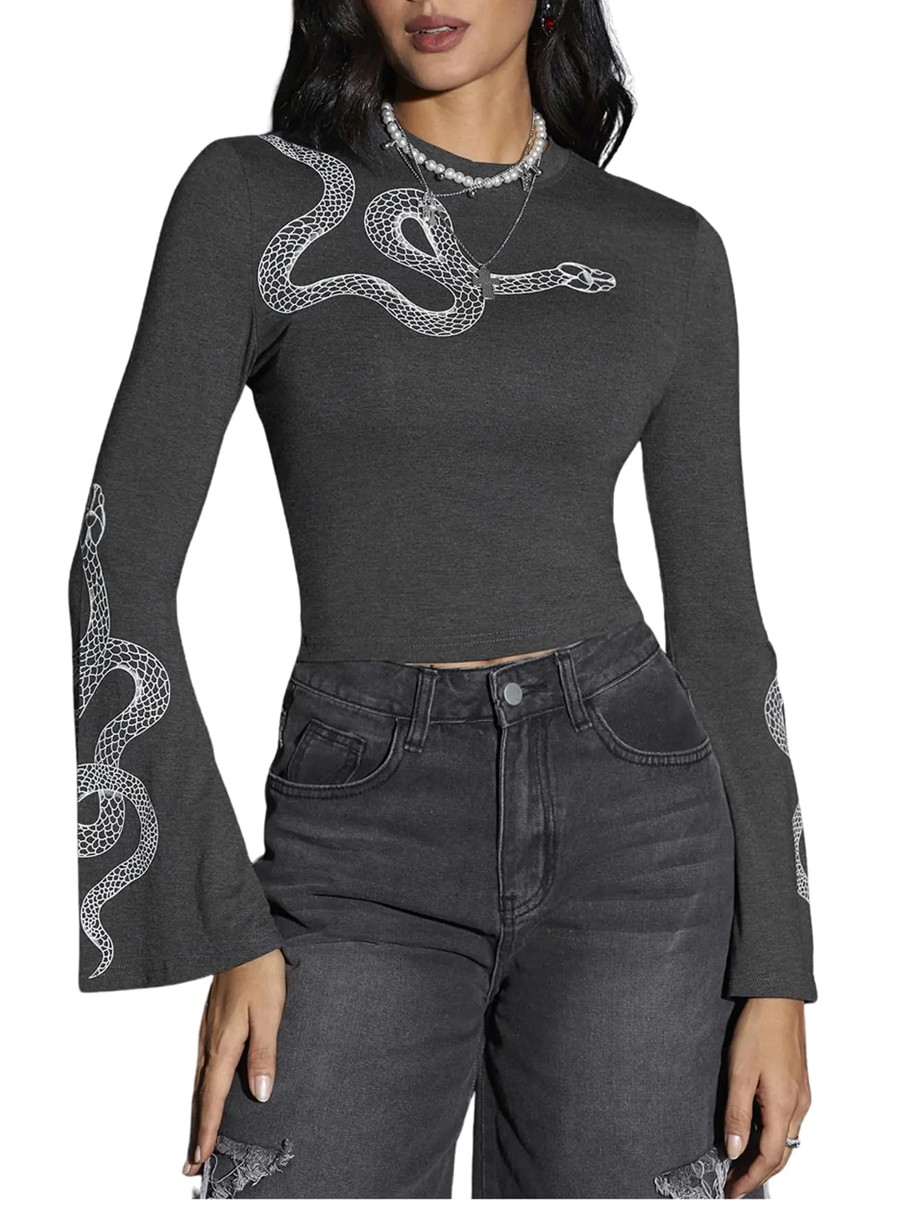 Verdusa Bell Sleeve Round Neck Snake Crop Tee Women: Embrace your bold side with this eye-catching graphic print slim-fit crop top. Featuring a comfortable crew neck and stylish long bell sleeves, this tee is crafted from soft, stretchy fabric ensuring an ideal fit and ease of movement.